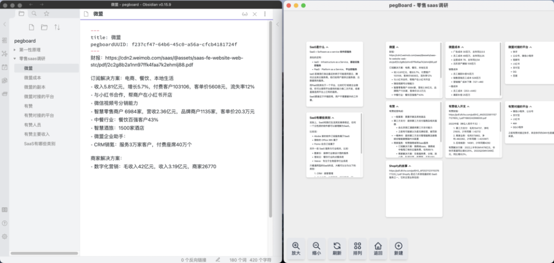 左侧是Obsidian,右侧是PegBoard,共享一个文件夹,且不会互相影响