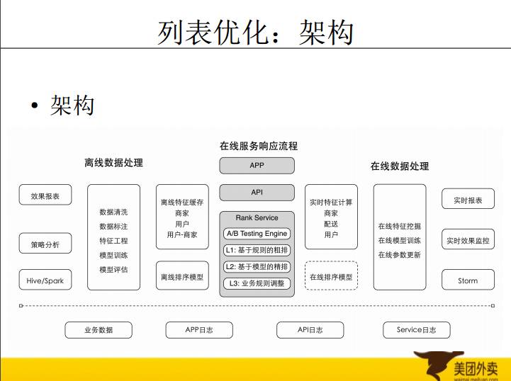 这个图是整个列表的一个架构,可以分为三个方面: 第一部分就是日志,这个数据分析、策略的源头;第二部分是我们离线处理,包括我们策略的分析、模型训练;第三部分为在线服务,前端打请求到API,API再请求对应的在线服务,这个有一些具体的模块:abtest测试框架,触发、排序框架,此外还有一些在线的实时的数据处理。