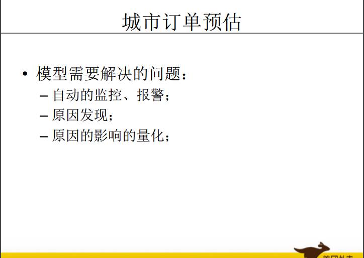通过模型需要解决的问题:首先需要做自动的监控、报警;第二模型需要发现其中造成异常,这个异常的原因是什么;确定这个原因之后,那我们需要知道这个原因对我们订单量到底是什么样一个影响,是一个量化的事情。