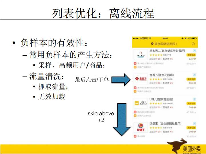 这模型训练过程中遇到的一个问题是如何选择负样本,正样本是用户显式的反馈。在很多场景都会遇到这个问题,没有负样本怎么办?会做负样本的选取。有几种方法:1,随机选取;2,选取用户没有行为的热门商品;3,从行为较多的用户的候选集合中选。负样本选取本质上是在猜可能看了什么但没发生行为,所以猜的越准,效果越好。在外卖列表场景下,我试了Skip-above的效果还不错。