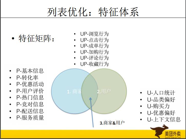 这是特征体系,传统做特征体系有三个方面,第一个是场景,第二个是用户,第三个是商品,两两相交,三者相交,有七个象限。在外面应用中,场景的特征不是太强,主要特征有三类就够了,一类是商家,第二个是用户,第三个是两者相交的部分,每个类型列举了一些例子。