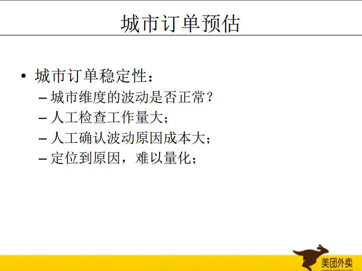 从城市纬度去看订单量的预估,这个里面第一个出发点是什么?每个城市都会有波动,这个波动到底是否是正常的,这个时候我们需要进行人工,每天有一百多个城市都需要确认,这个工作量非常大。影响这个订单量背后的因素非常多,人工的方法很难确认到底这个波动由哪个因素造成的。即使找到了这个因素,这个因素带来的订单量增长的一个具体的数量,人工不太好确定的,这是是人工做的时候遇到的一些问题。