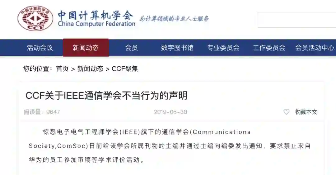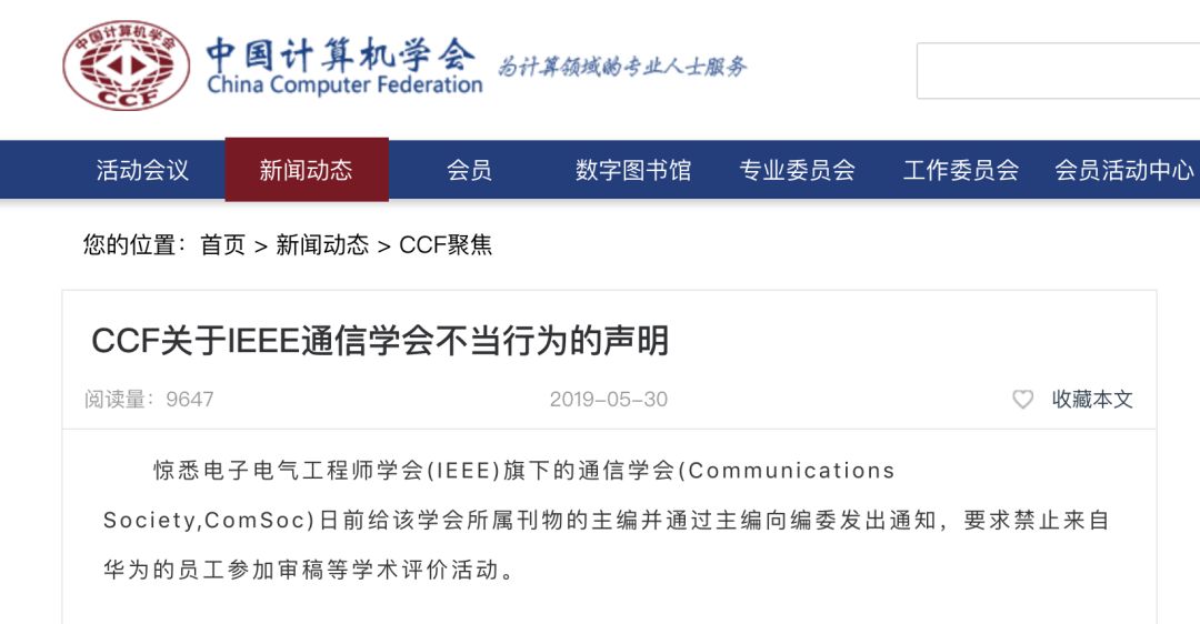 30日,中国计算机学会(CCF)发出声明,暂时中止与IEEE旗下通信学会(ComSoc)的一切交流与合作,即刻生效。