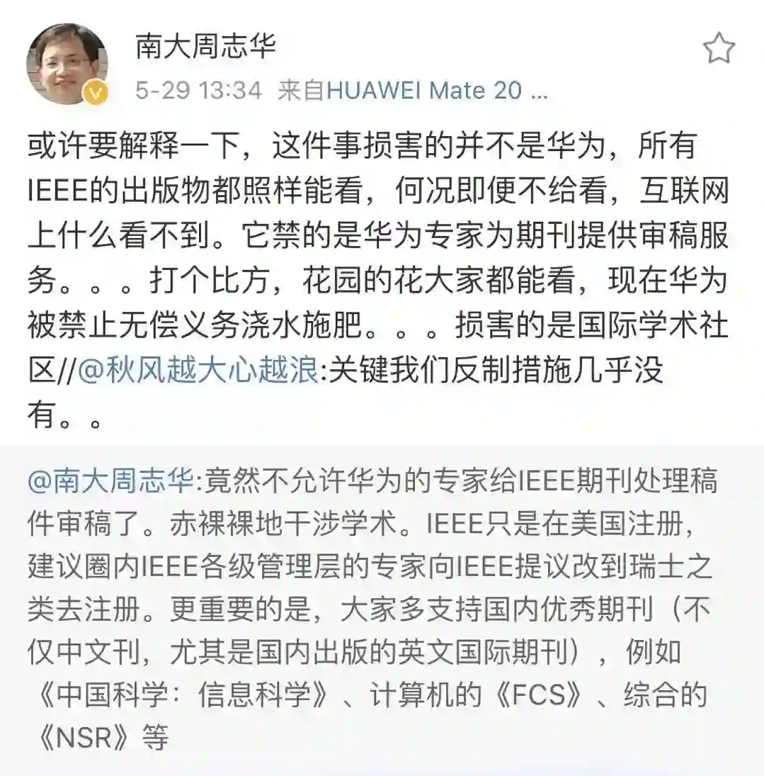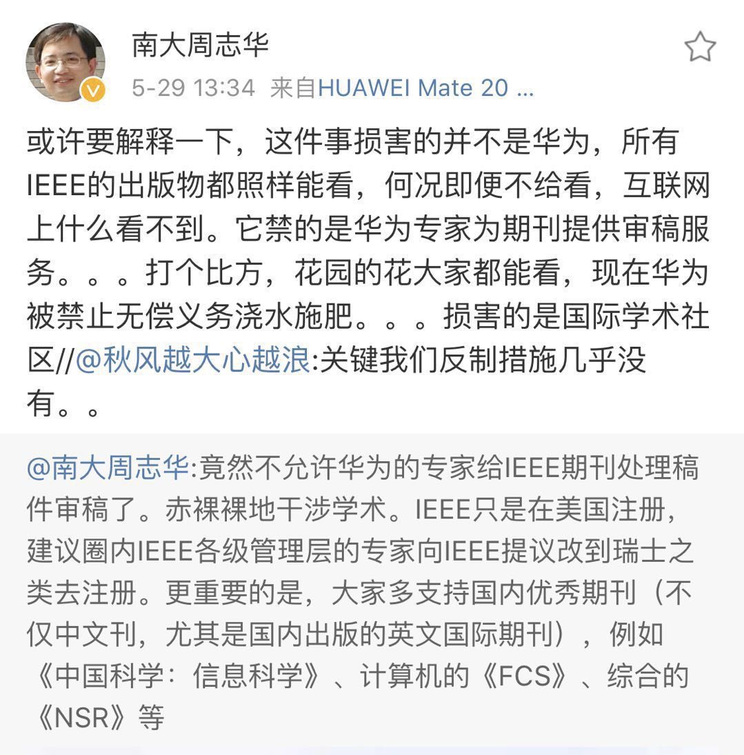 或许要解释一下,这件事损害的并不是华为,所有IEEE的出版物都照样能看,何况即便不给看,互联网上什么看不到。它禁的是华为专家为期刊提供审稿服务。。。打个比方,花园的花大家都能看,现在华为被禁止无偿义务浇水施肥。。。损害的是国际学术社区。