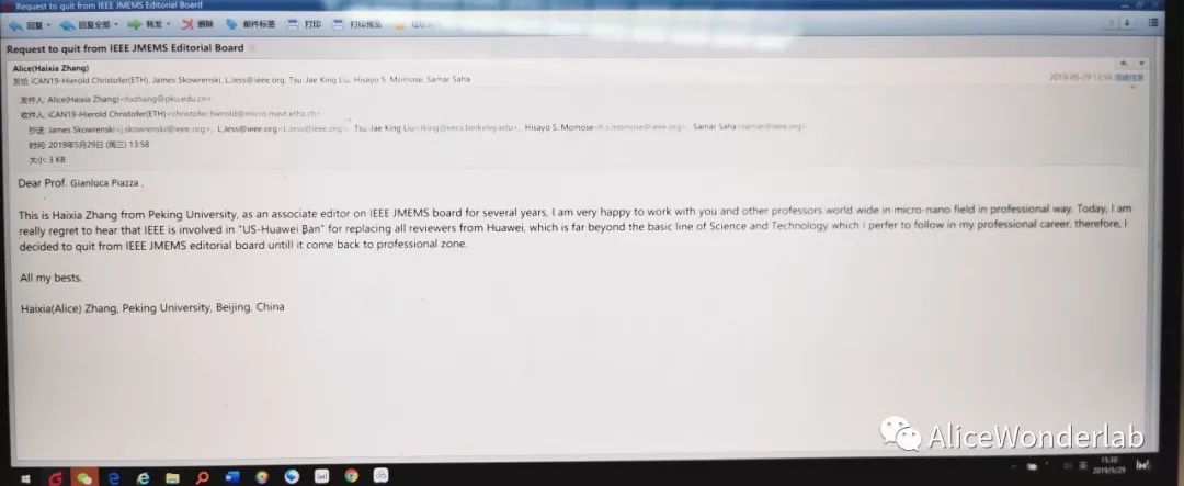 我是北京大学的张海霞,作为IEEE NANO的副主编已经很多年了,我很高兴能够与您和世界各地的教授们在微纳领域进行专业的合作。今天,我很遗憾地听到IEEE参与美国对华为的禁令,替换了所有华为的审稿人一事,这远远超出了我所接受、并在职业生涯中一直坚持的科学与技术的底线,因此,我决定退出IEEE NANO编辑委员会,直到其重新回归专业范围。