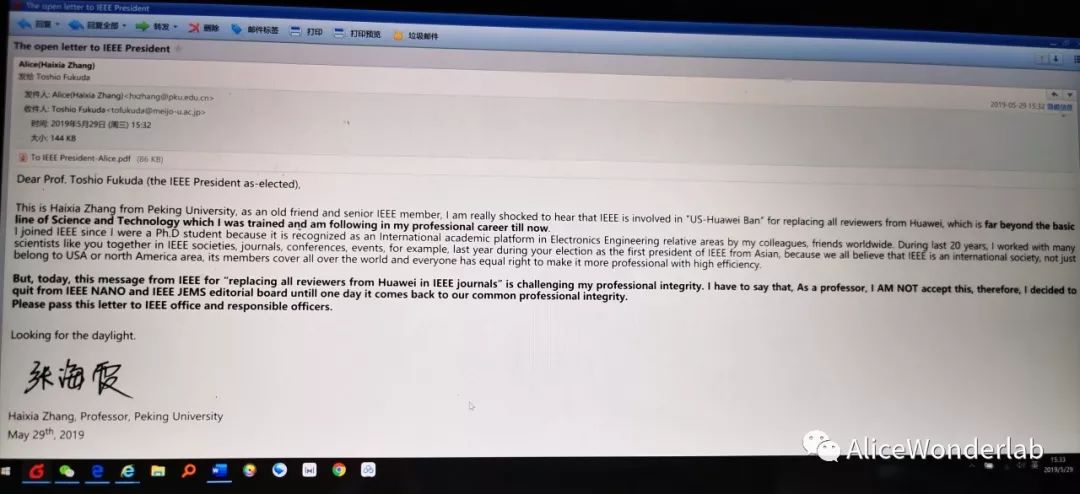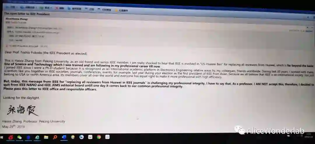 张海霞老师研究室公众号“AliceWonderlab”发表了其对IEEE主席的公开信: