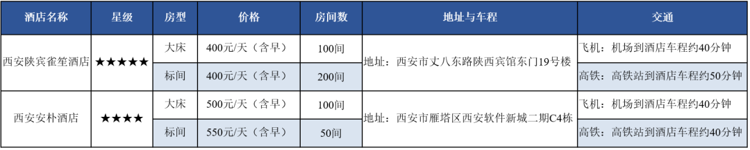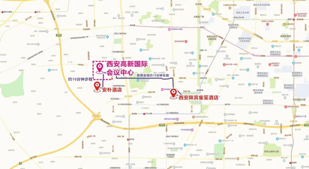 本次大会选取西安高新国际会议中心附近的酒店作为各参会代表的住宿酒店。住宿酒店(除西安安朴酒店外)组委会将安排大巴车统一接送。西安安朴酒店距西安市高新国际会议中心较近,约5分钟车程,步行约15分钟。酒店预订链接: