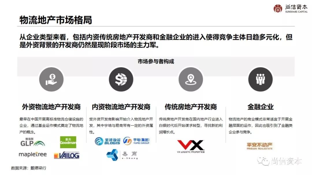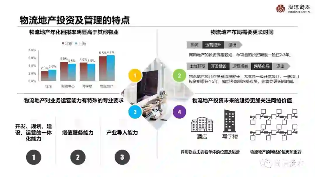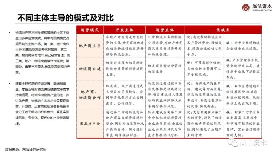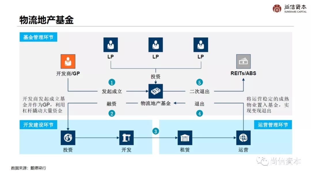 现代物流地产以物流园区为核心载体,建设、运营与管理物流仓库、配送中心、分拨中心等专用物流设施,并与制造企业、物流企业、零售企业等供应链环节上的客户建立合作关系,提供包括园区租赁、园区运营、配送服务等在内的增值服务。物流地产主要经营环节包括选址拿地、开发建设、运营管理以及基金运作等。