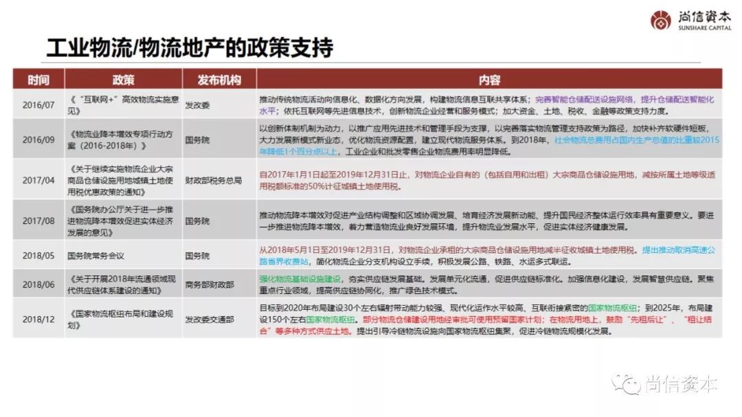 | 2018/12 | 《国家物流枢纽布局和建设规划》 | 发改委交通部 | 目标到2020年布局建设30个左右辐射带动能力较强、现代化运作水平较高、互联衔接紧密的国家物流枢纽;到2025年,布局建设150个左右国家物流枢纽。部分物流仓储建设用地经审批可使用预留国家计划;在物流用地上,鼓励“先租后让”、“租让结合”等多种方式供应土地。提出引导冷链物流设施向国家物流枢纽集聚,促进冷链物流规模化发展。 |