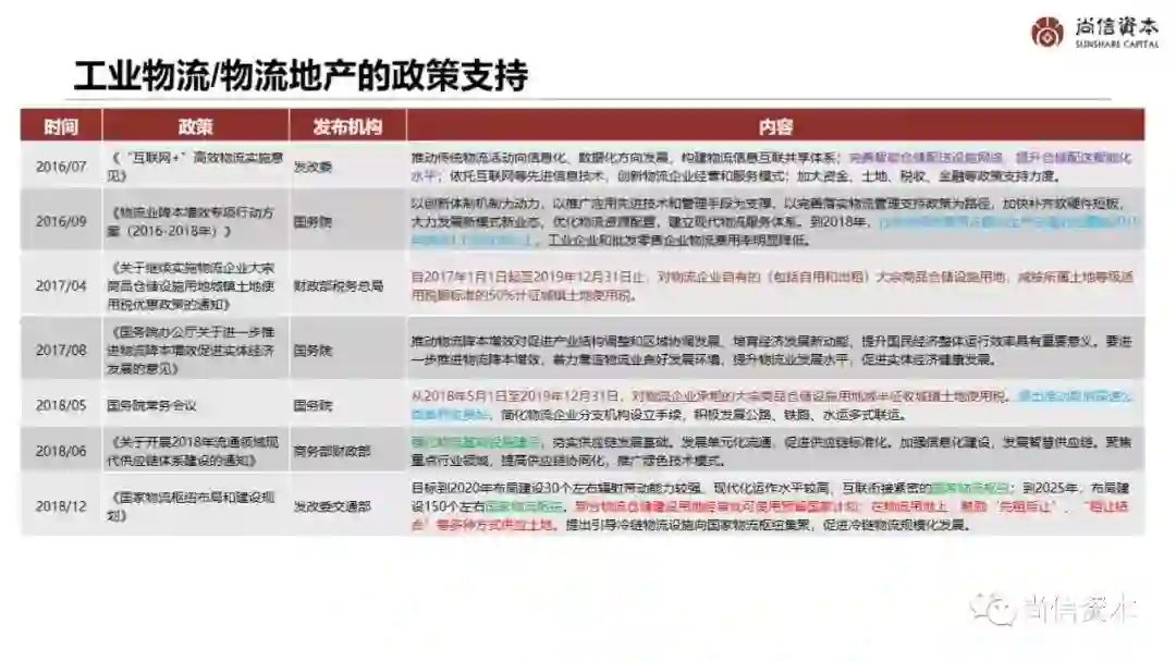 | 2016/07 | 《“互联网+”高效物流实施意见》 | 发改委 | 推动传统物流活动向信息化、数据化方向发展,构建物流信息互联共享体系;完善智能仓储配送设施网络,提升仓储配送智能化水平;依托互联网等先进信息技术,创新物流企业经营和服务模式;加大资金、土地、税收、金融等政策支持力度。 |