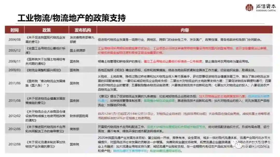 | 2012/08 | 《关于深化流通体制改革加快物流产业发展的意见》 | 国务院 | 2020年我国流通产业发展总体目标:建立起统一开放、竞争有序、安全高效、城乡一体的现代流通体系,流通产业现代化水平大幅提升,对国民经济社会发展的贡献进一步增强。 完善财政金融支持政策,拓宽流通企业融资渠道,支持符合条件的大型流通企业上市融资;加大流通业用地支持力度;减轻流通产业税收负担,在一定期限内免征农产品批发市场、农贸市场城镇土地使用税和房产税;降低流通环节费用等手段;制定完善流通网络规划。 |