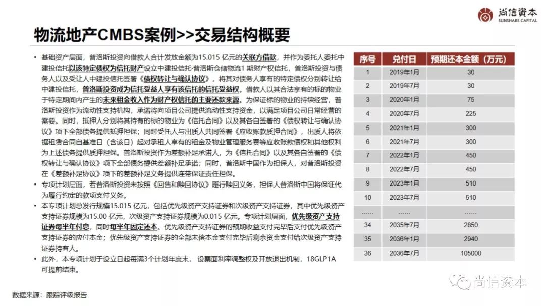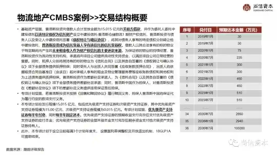 基础资产层面,普洛斯投资向借款人合计发放金额为15.015 亿元的关联方借款,并作为委托人委托中建投信托以该特定债权为信托财产设立中建投信托·普洛斯仓储物流1 期财产权信托,普洛斯投资与债务人以及受让人中建投信托签署《债权转让与确认协议》,将其对债务人享有的特定债权分别转让给中建投信托,普洛斯投资成为信托受益人享有该信托的信托受益权。借款人以其合法享有的标的物业于特定期间内产生的未来租金收入作为财产权信托的主要还款来源。为保证标的物业的持续经营,普洛斯投资作为流动性支持机构,承诺将向项目公司提供流动性支持资金,以满足项目公司日常经营的需要。同时,抵押人分别将其持有的标的物业为《信托合同》以及其各自签署的《债权转让与确认协议》项下全部债务提供抵押担保;同时受托人与出质人共同签署《应收账款质押合同》,出质人将依据租赁合同自基准日(含该日)起对承租人享有的租金及物业管理服务费等应收账款债权和其他权利为上述债务提供质押担保。普洛斯投资作为差额补足承诺人,为《信托合同》以及其各自签署的《债权转让与确认协议》项下全部债务提供差额补足承诺;同时,普洛斯中国作为担保人,对普洛斯投资在《差额补足协议》项下的差额补足义务提供连带保证责任担保。