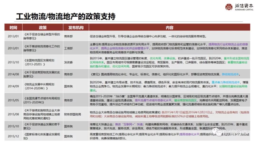 | 2013/01 | 《关于促进仓储业转型升级的指导意见》 | 商务部 | 促进仓储业转型升级,引导仓储企业由传统仓储中心向多功能、一体化的综合物流服务商转型。 |