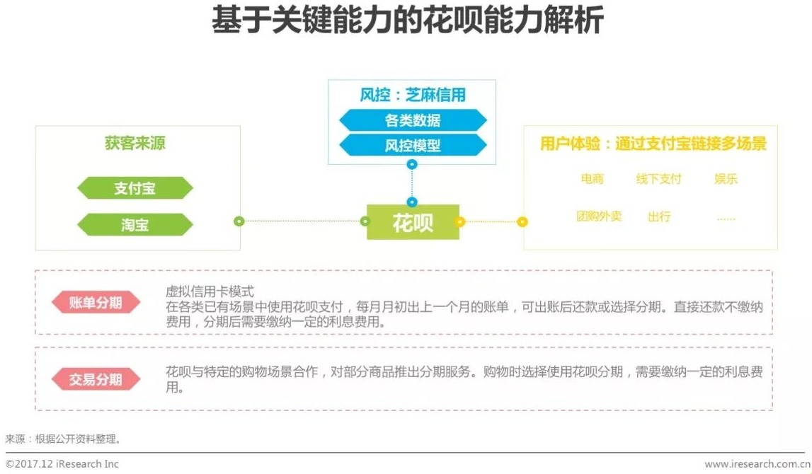 2017年预计花呗放贷规模超9000亿,借呗放贷规模超5000亿。花呗模式分为账单分期和交易分期,账单分期为虚拟信用卡模式。就三大能力而言,花呗从支付宝、淘宝获取用户,利用芝麻信用为用户提供额度、计算费率。使用场景多是花呗在用户体验上明显优势,借助支付宝打通的支付场景,花呗嵌入到支付方式中,从而打通各类支付场景。
