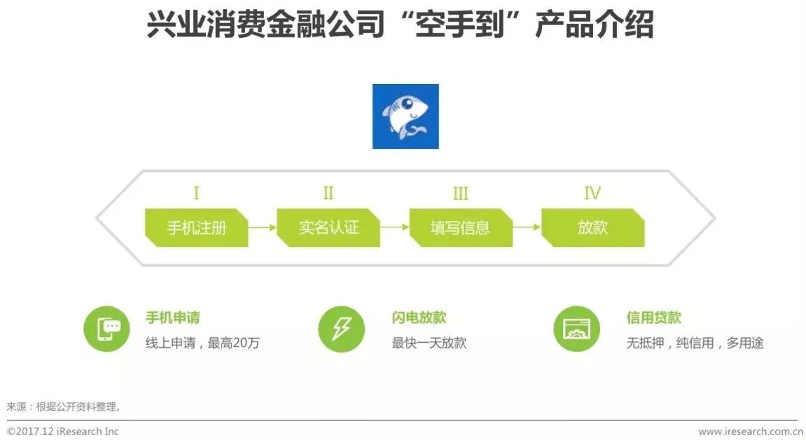 兴业消费金融通过“空手到”系列产品开展互联网消费金融业务,空手到APP提供家庭综合消费贷和闪电贷两款产品。闪电贷采用邀请制,具备相应资质的用户通过手机线上申请,无需抵押担保,利用信用评估的方式授予用户额度、费率,通过评估后利用手机APP直接放款,最快一天放款。