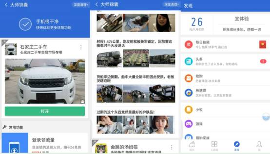 为了延长用户时间,猎豹清理大师还在“发现”版块加入了头条、小说、电商(链接到天猫商城)、游戏等项目,甚至带上猎豹全家桶。而猎豹的另一款手机管理软件“猎豹安全大师”在扫描资料后也会出现刷不完的信息流。