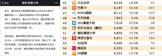 QM排行榜推出之后,猎豹清理大师公众号推出了《QM报告:猎豹清理大师人均月度使用时长稳居行业第一》,猎豹清理大师的人均时长是107个小时,而用户规模排名第一的360清理大师的月度人均时长却只有28个小时,更验证了猎豹拖着用户“杀时间”(Kill time);以及360清理大师坚持尽量帮用户省时间(Save time),也算求仁得仁、各美其美。