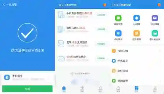 前段时间下载2G的《摔跤吧!爸爸》,手机运行起来明显有些卡顿,用清理大师竟压缩到了100兆,画质还算清晰;QQ里面有各种做行业调研的群,里面的消息处于接受不提醒状态,用360清理大师可一键识别和清理一些缓存、垃圾图片等等。