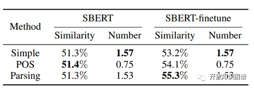 论文作者对图谱构建的过程和图谱进行了多次实验评估。在事件抽取和匹配方法层面,论文作者随机抽取了100个文段对其进行评估,Parsing为作者提出的方法, POS为使用基于词性标记的模板来提取事件的方法,而Simple为仅在匹配之前根据标点分割和过滤话语的方法。虽然这三种方法在没有微调的情况下具有相似的平均相似性,但Parsing在微调后与Simple和POS相比,性能都得到了较大提升,如图三所示: