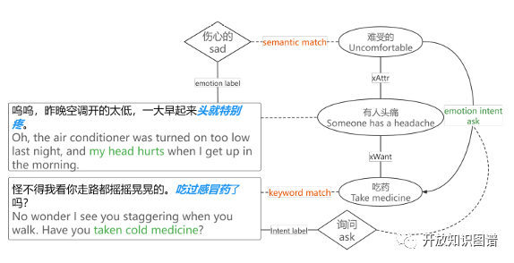在图谱的边构建方面,研究人员提出了三种边来反映不同类型的对话流,并着重介绍了Head-Head Edge构建和Tail-Tail Edge的构建,一个事件流Head-Head Edge构建的图示如上图。下图展示了一个情感意向边(Emotion-Intent Edge)的构建过程。研究人员首先将“不舒服”的情绪与话语情感标签“悲伤”相匹配,随后发现在下一个文段中出现了吃药。因此,一个从“不舒服”到“吃药”的情感意向边被构建出来,并在边上添加了第二个话语“问”的意向标签,如下图所示