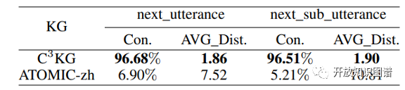 加入了ATOMIC-zh的对比结果显示出了该论文提出的事件流的有效性,其在文段匹配中显示出更高的连通性和更短的距离。此外,论文作者也提出了一些图谱任务,并将C3KG进行了任务测试。