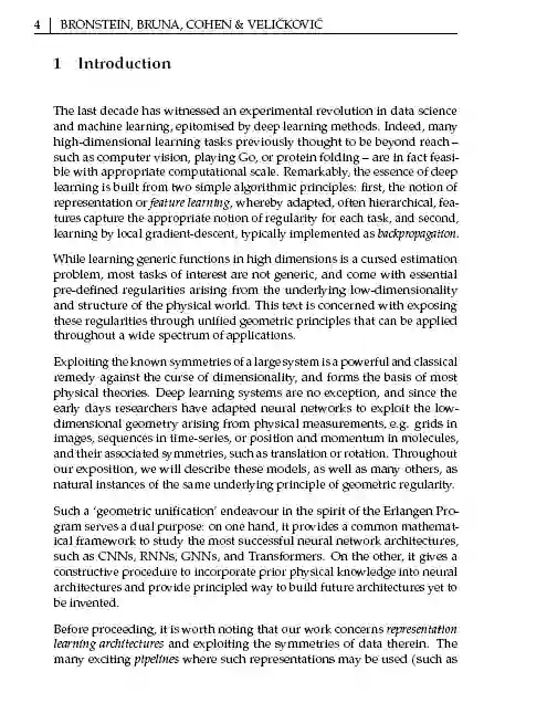 几何深度学习是一种从对称性和不变性的角度对大量ML问题进行几何统一的尝试。这些原理不仅奠定了卷积神经网络的突破性性能和最近成功的图神经网络的基础,而且也提供了一种原则性的方法来构建新型的问题特定的归纳偏差。