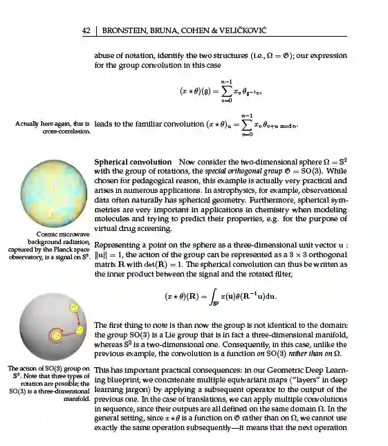 更进一步,我们在一些不太标准的领域(如同质群和流形)上使用了我们的框架,这表明框架可以很好地表达这些领域的最新进展,如球形CNN, SO(3)-变换器,和规范-等变网格CNNs。