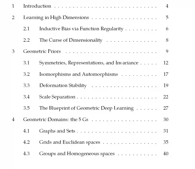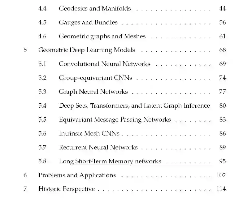 几何深度学习的“5G”:网格、组(具有全局对称性的齐次空间)、图(以及作为特定情况的集)和流形,其中几何先验通过全局等距不变(可以用测地线表示)和局部规范对称来表现。