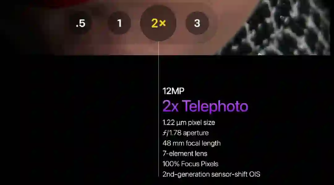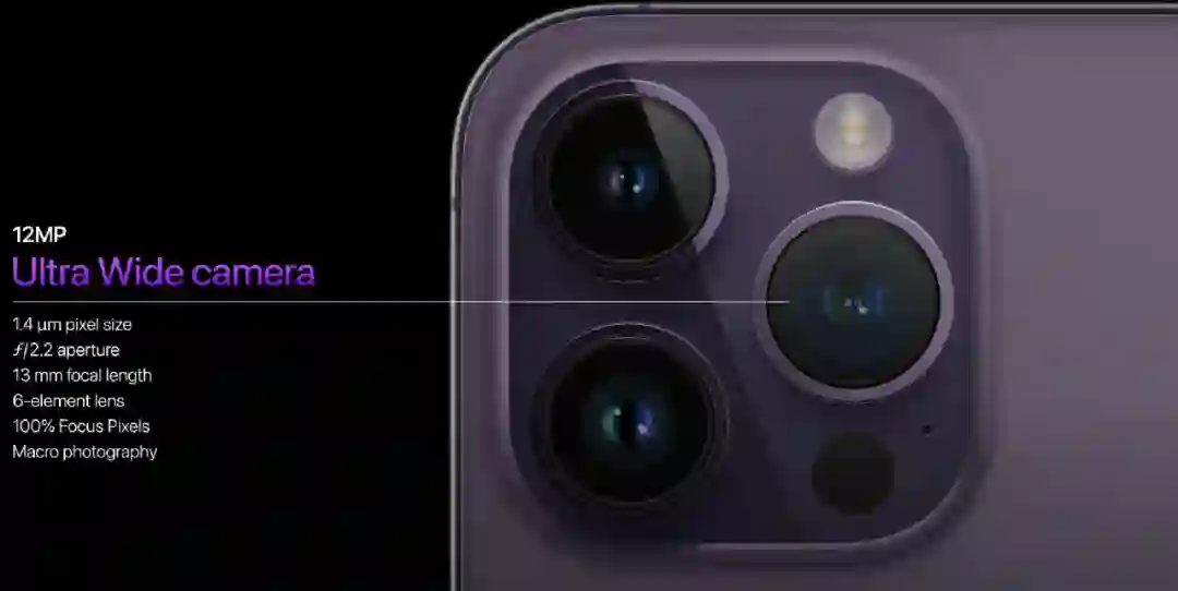 超广角具有 1200 万像素,支持 1.4 微米像素尺寸,13 毫米焦距,ƒ/2.2 光圈,120° 视角,六镜式镜头和 100% Focus Pixels。