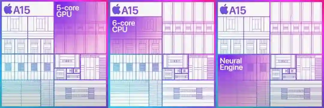 这两款机型沿用了去年 iPhone 13 Pro 搭载的 A15 仿生芯片,采用台积电 5nm 工艺。搭载了 5 核 GPU、6 核 CPU(2 个性能核和 4 个能效核)和 16 核 NPU。