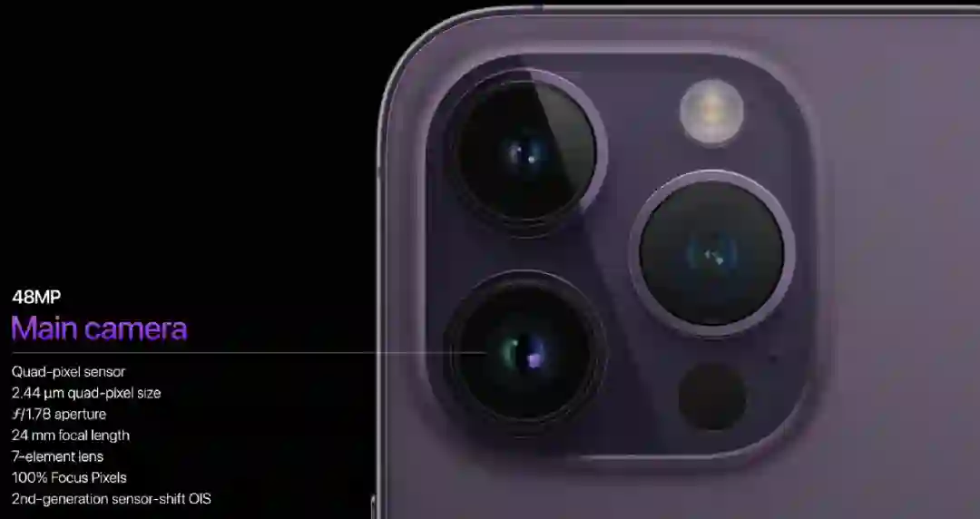 影像方面相较 iPhone 14 系列有了大幅提升。后置采用全焦段三摄设计,主摄升级为 4800 万像素,最高 4 倍分辨率,24 毫米焦距,迄今为止最大的四合一像素传感器(较 13 Pro 大了 65%),2.44 微米四合一像素,ƒ/1.78 光圈,第二代传感器位移式光学防抖等。