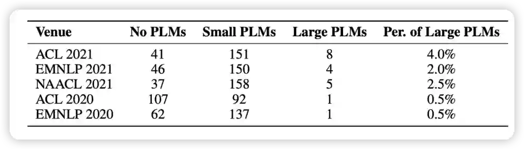 在近期论文《Delta Tuning: A Comprehensive Study of Parameter Efficient Methods for Pre-trained Language Models》中,来自清华大学和北京智源人工智能研究院的研究者随机选取了 1000 篇来自最近五个 NLP 会议的论文,发现使用预训练模型已经成为了研究的基本范式,但涉及大模型的却寥寥无几(如下图 1 所示)。