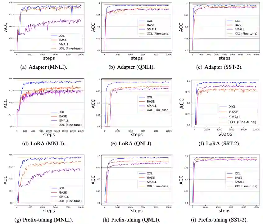 另一方面,当 PLM 的规模变得非常大时,跨不同层随机选择模块来微调可以实现出色的性能。总的来说,上述结果表明,随着 PLM 模型规模的增长,各种微调方法的性能 / 收敛速度得到显著提升可能是 Delta Tuning 的常见现象。