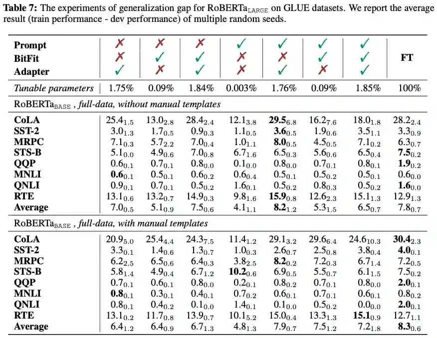 :各种微调方法对训练数据的记忆能力(Memorization)和泛化能力(Generalization)不尽相同。为此,研究者报告了 RoBERTa-large 在全量数据设置下的泛化差距(训练集效果 - 开发集效果),结果如下表所示,从中可以看出,(1)单个 Delta Tuning 方法的泛化差距总是小于 Fine-tuning,这意味着过度参数化可能有助于更好地记忆(过度拟合)训练样本。在所有 Delta Tuning 方法中,Prompt Tuning 往往具有最小的泛化差距。考虑到每种 Delta Tuning 方法均可以很好地泛化并在开发集上表现出非平凡的性能,因此过度拟合训练集可能不是良好泛化的必要条件;(2) 一般来说,组合几个 Delta Tuning 方法会增大泛化差距,甚至达到与 全 Fine-tuning 相当的程度。这表明,记住训练集(Memorization)可能不需要微调过多;换句话说,在 PLM 进行下游任务适应时,即使模型可微调的容量很小,也足够很好地记忆训练集;(3) 使用人工模板一般不会影响泛化差距。