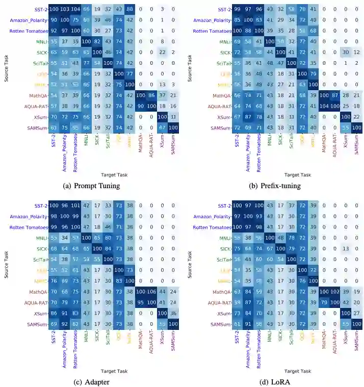 研究者研究了不同下游任务之间 Delta Tuning 方法的可迁移性,具体而言,我们采用了 4 种 Delta Tuning 方法(Prompt Tuning、Prefix-Tuning、Adapter 和 LoRA)和 5 种不同类型的 12 个 NLP 任务(包括情感分析、自然语言推理、转述识别、问答、总结),并将在源任务上训练好的 Delta 参数迁移到目标任务上,测试 zero-shot 迁移效果。