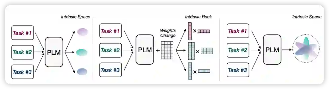 这类低维假设不仅适用于单任务的适配,还可以将其扩充到多任务的场景。IPT 假设对于多个任务存在着同一个低维本征子空间,而仅仅调整子空间的参数就可以同时在 100 多个 NLP 任务上达到令人满意的效果。此方法没有使用随机子空间,而是试图找到一个由多个 NLP 任务共享的公共子空间。实验表明,在一个 250 维的低维子空间内,仅仅通过调整 250 个参数,就可以在 100 多个 NLP 任务上复现 Prompt Tuning 超过 80% 的性能。