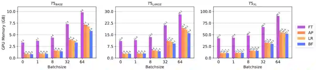 :Delta Tuning 可以减少参数的梯度计算,从而节省 GPU 显存,体现了计算资源上的高效。为了具体验证 Delta Tuning 对 GPU 显存的效率提升,研究者进行了实验以比较不同 Delta Tuning 方法在不同规模的 PLM 上微调所消耗的 GPU 显存。