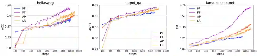 :研究者节选了部分数据集上的不同微调方法在不同训练步数下性能的变化,其中由于 PT 相比其它方法而言收敛速度过慢,没有列入上图。可以发现,总的来说,这些微调方法的收敛速度排序为:FT > AP ≈ LR > PF。尽管 PF 在所有 Delta Tuning 方法中可调参数数量最多,但仍然面临一些收敛困难,因此收敛速度与可微调的参数量也没有直接的联系。
