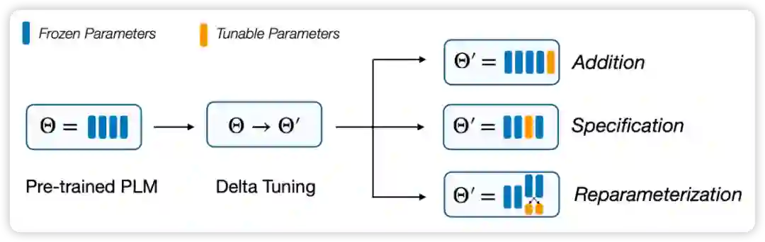 这些方法本质上都是在一个「增量」(Delta Paremters)上进行调整,因此将它命名为 Delta Tuning