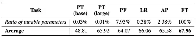 研究者首先选取全参数Fine-tuning和四种具有代表性的Delta Tuning方法(包括Prompt Tuning(PT)、Prefix-Tuning(PF)、LoRA(LR)和Adapter(AP))对