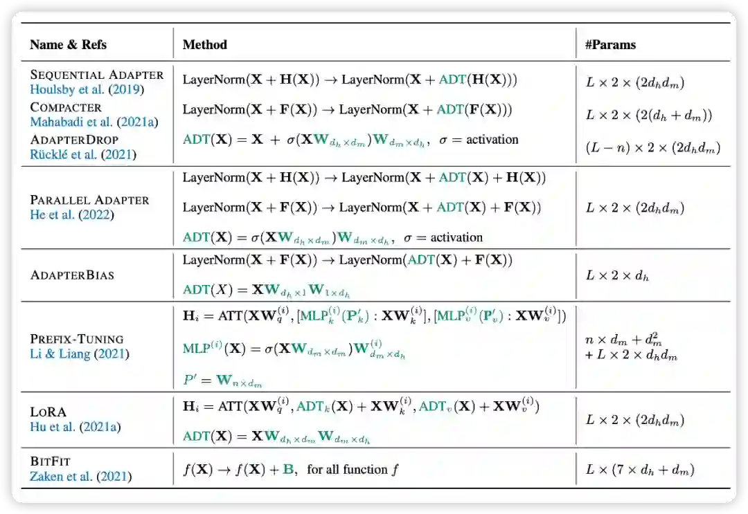 和 Transformer 中的残差连接来描述。而无论是对 Addition-based 方法的 Adapter 和 Prefix,还是指定式方法的 BitFit,亦或是重参数化方法的 LoRA,都可以推导出这样一个函数