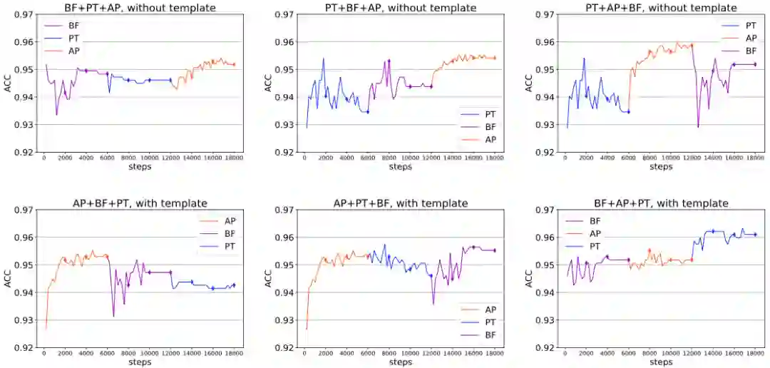 研究者在 SST-2 情感分类数据集上,在使用 / 不使用人工模板的情况下对 RoBERTa-large 进行实验。结果在下图所示(节选),从中可以得出,在某些情况下,可以通过不断引入新的 Delta Tuning 方法,整体性能能够得到不断提高,从而验证了顺序组合的优势;同时也发现,在不同的设置下,不存在固定最优的组合顺序。最优的组合方式可能会因为不同的下游任务、使用的模型架构等等因素而变化。