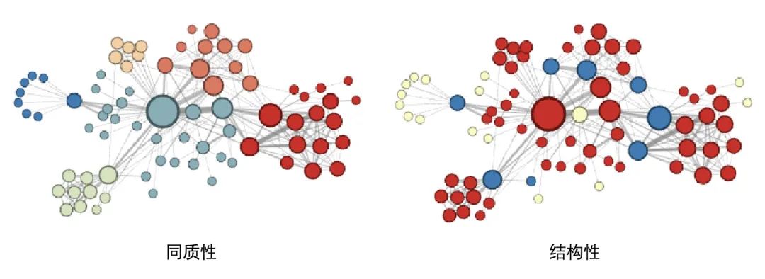 下图是作者通过调整p和q,使embedding向量更倾向于表达同质性和结构性的可视化结果: