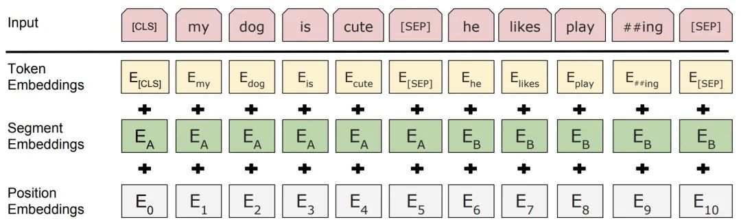 BERT的输入的编码向量(长度为512)是3种Embedding特征element-wise和,如下图所示: