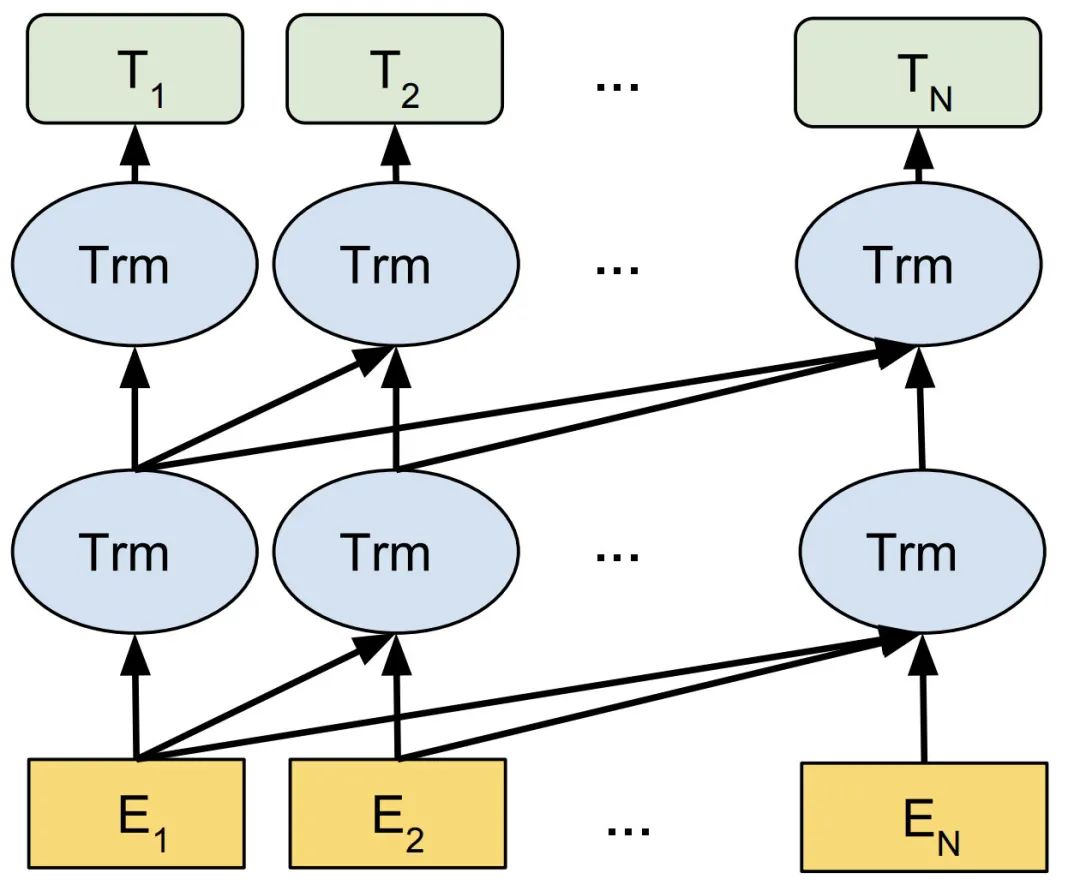 由于当时并没有提出现在火热的Transformer结构,ELMo采用的是多层双向LSTM来搭建模型。在给定一个包含N个token的文本(t1, t2, ..., tN):