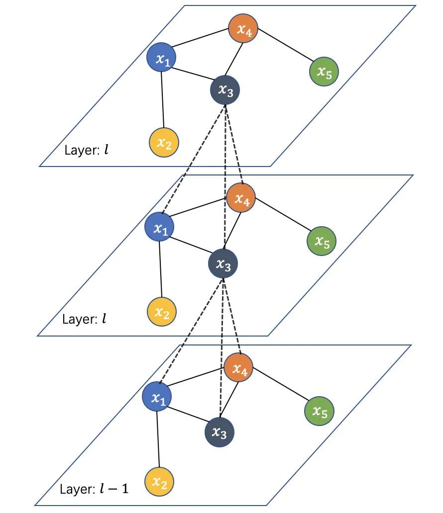 Thomas等人在2017年对上式做了进一步简化:限制每个卷积层仅处理一阶邻居特征,通过采用分层传播规则叠加多层卷机,从而实现对多阶邻居特征的传播。通过限制卷机核的一阶近似能缓解节点度分布非常宽的图对局部邻域结构的过度拟合问题。如下图所示,通过集联多个卷积层,节点 能聚合多个邻居节点特征。