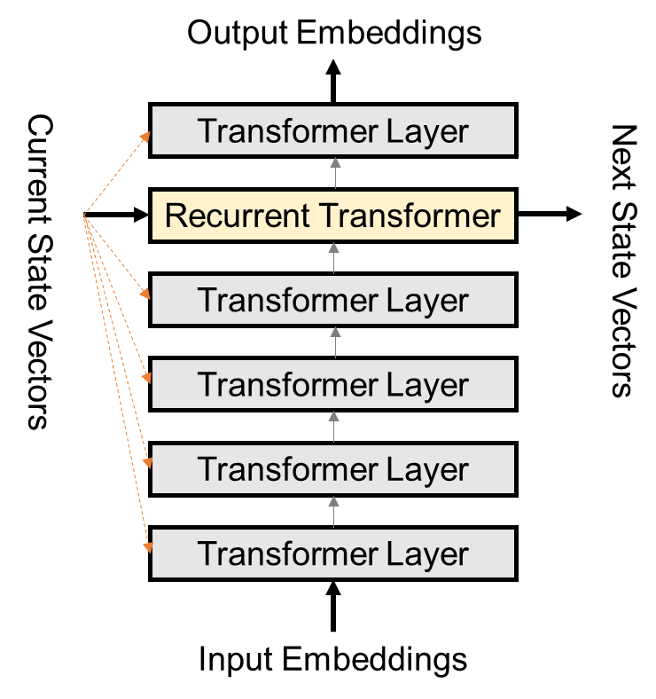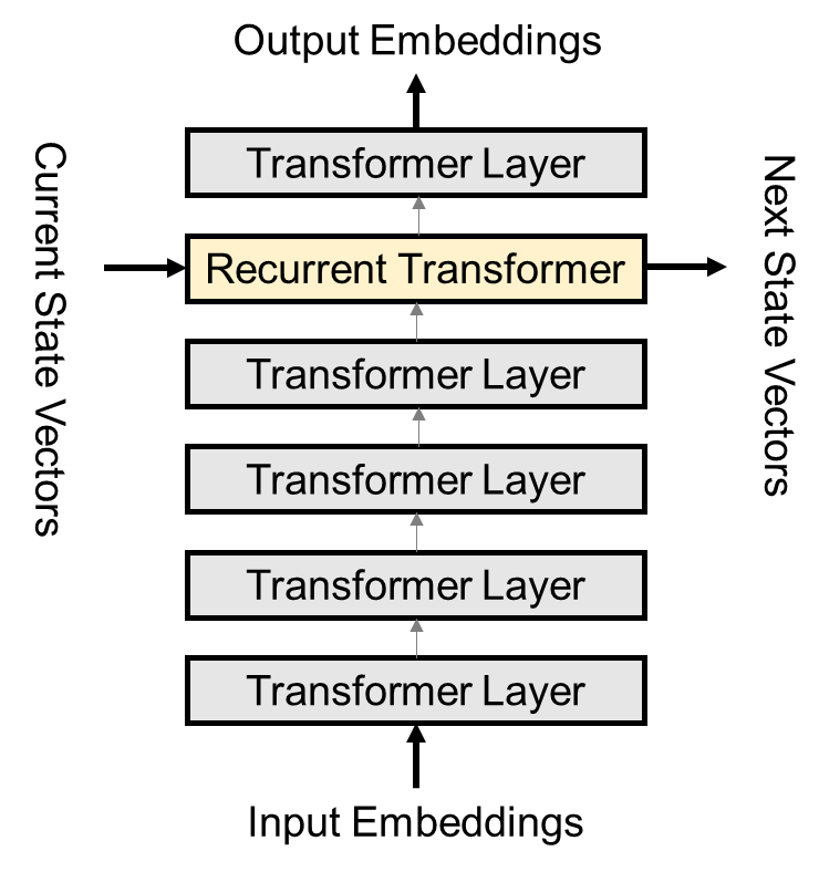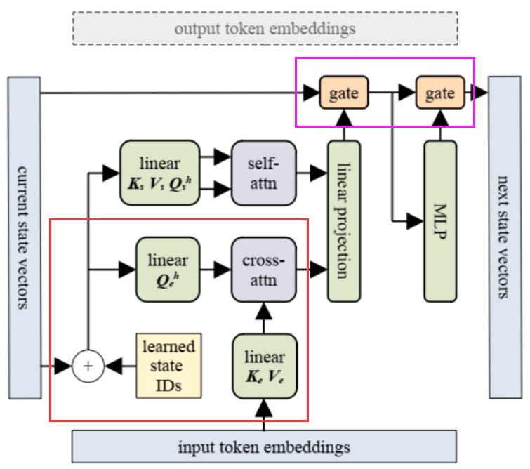 和传统的 Transformer layer 非常相像,差别只集中在红框标识出来的部分。在这一部分中,为了融合上一个循环单元给的 current state 信息,他们将 input embeddings 和 current state vectors 做了一个 cross attention。另一方面,input embeddings 自身也会过一个 self-attention 层。这两部分拼接后,通过线性层融合在了一起。