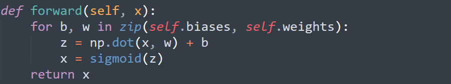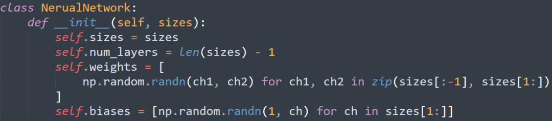 图 5 是类 NerualNetwork 的初始化,进而构建一个神经网络,分别对神经网络的尺寸(有几层,每一层的单元数是多少),每一层的权重和偏置进行初始化。