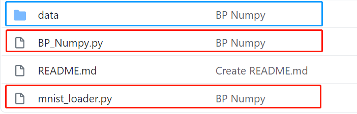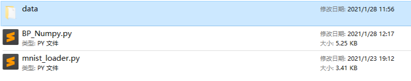 本文的代码结构非常简单如下图所示一共三个文件。data 文件夹下是 mnist 手写体数字集的压缩包 mnist.pkl.gz;mnist_loader.py 是用于加载 mnist 数据集的;BP_Numpy.py 是 BP 训练神经网络的程序,也是本文重点要讲的程序。