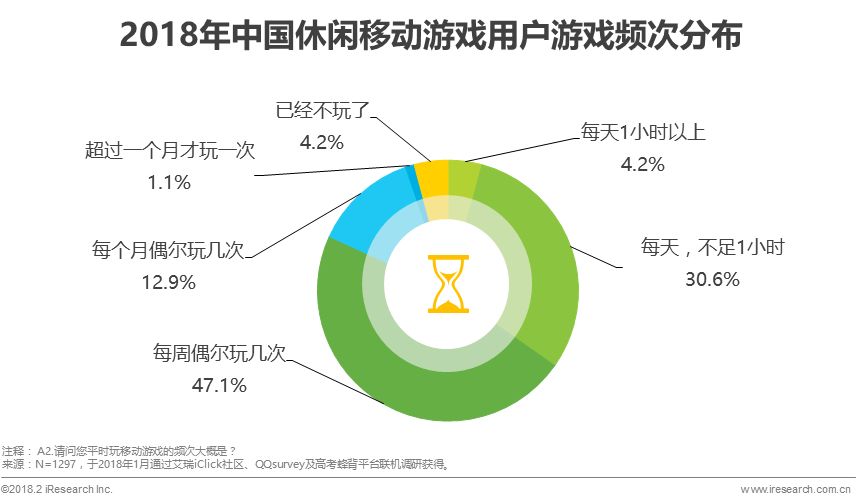 游戏频次方面,市场上仅35%的用户表示自己每天都会玩休闲移动游戏,市场整体用户游戏频次较低。当然这也与休闲游戏市场定位及游戏设计普遍偏轻度有着紧密的关系。